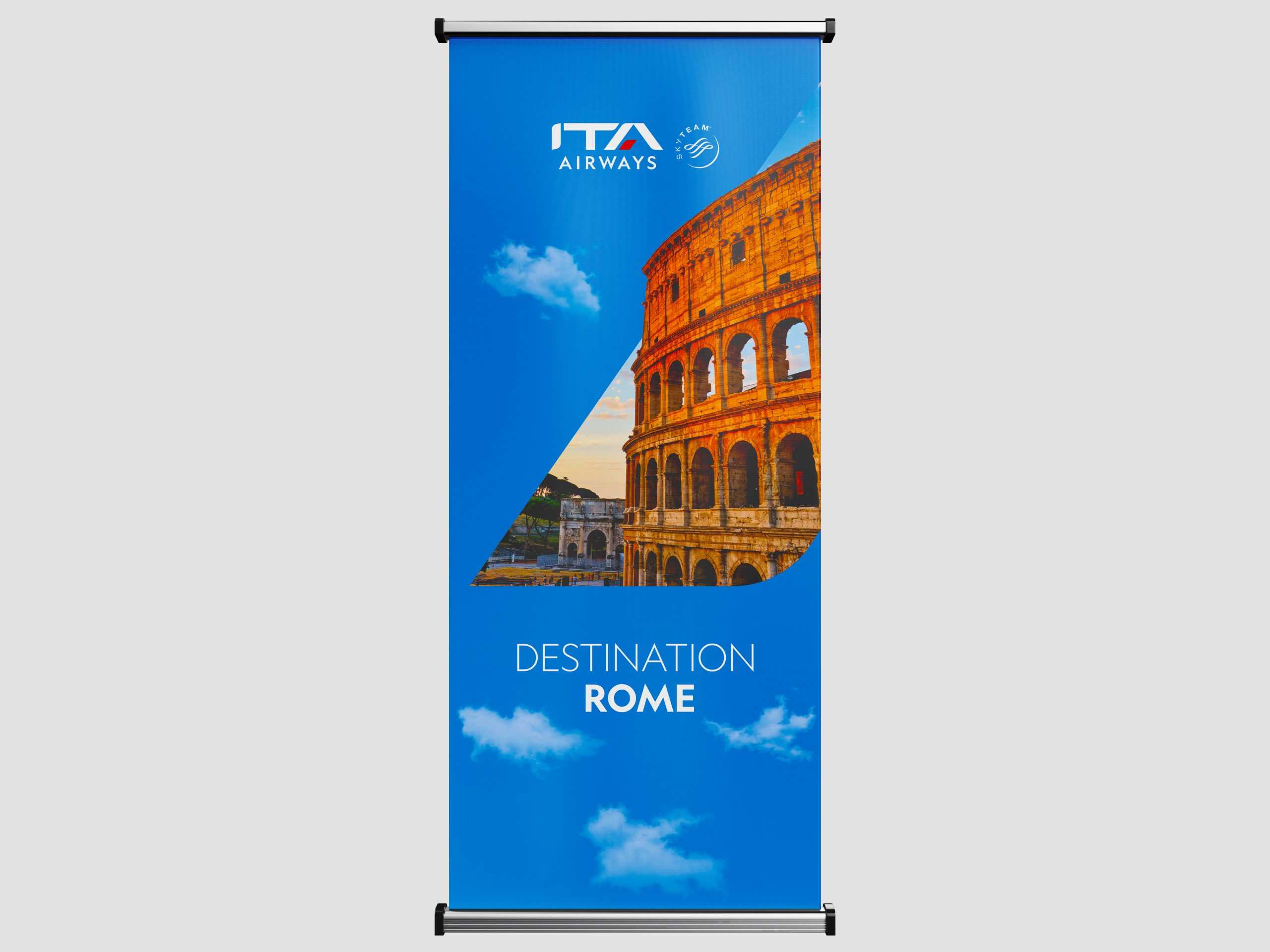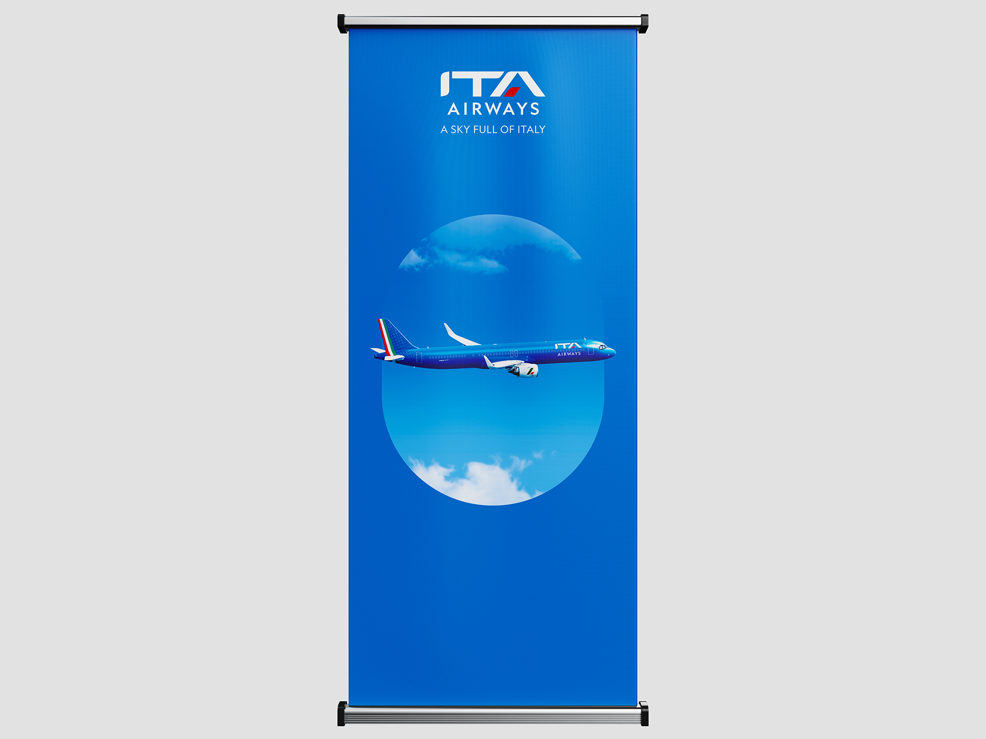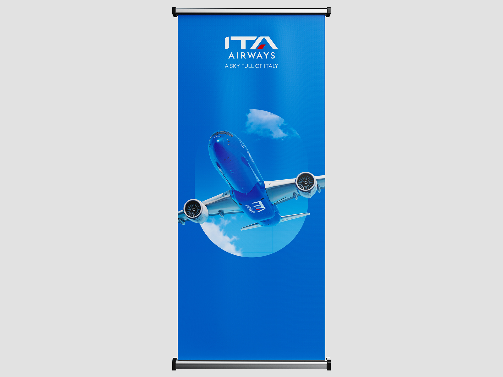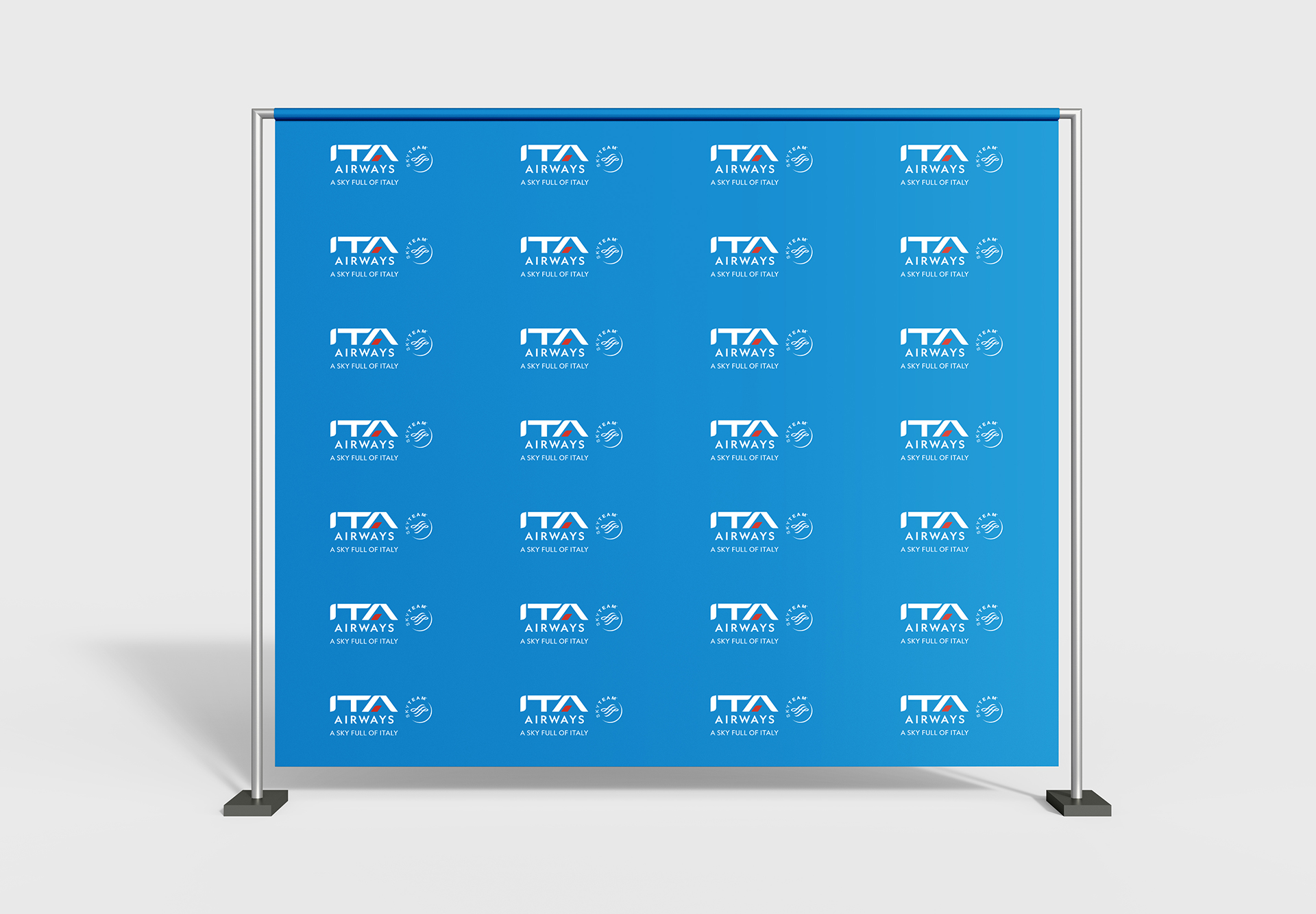 MDM Creative in partnership with our print store maidenheadprinting.com have produced various large format fabric backwalls, rollerbanners and signage. Often with very tight deadlines. These are produced to the strict brand guidelines set out by ITA Airways.